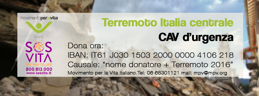 ccb Fineco intestato a Movimento per la Vita Italiano, cod. IBAN IT61J0301503200000004106218 – causale: Terremoto 2016 Italia Centrale.