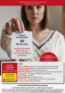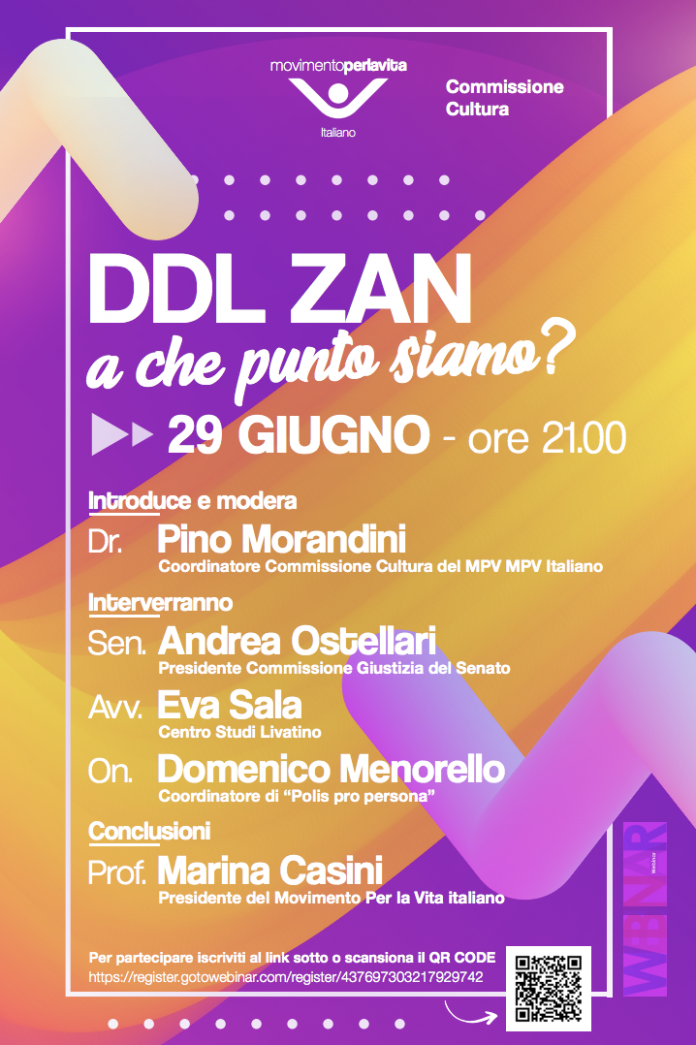 Nell’occasione verrà ricordato anche l’importante seminario del 1° luglio p.v. promosso dal network “Polis pro persona”. Intitolato “Contro le discriminazioni? Sì, ma non così”, il seminario che si svolgerà nella sala Nassyria del Senato, si propone di ascoltare le molte voci contro gli esiti illiberali del DDL Zan. L’incontro verrà trasmesso in diretta sulla pagina Facebook del Movimento per la Vita Italiano.